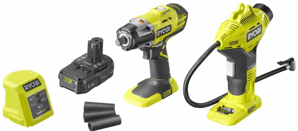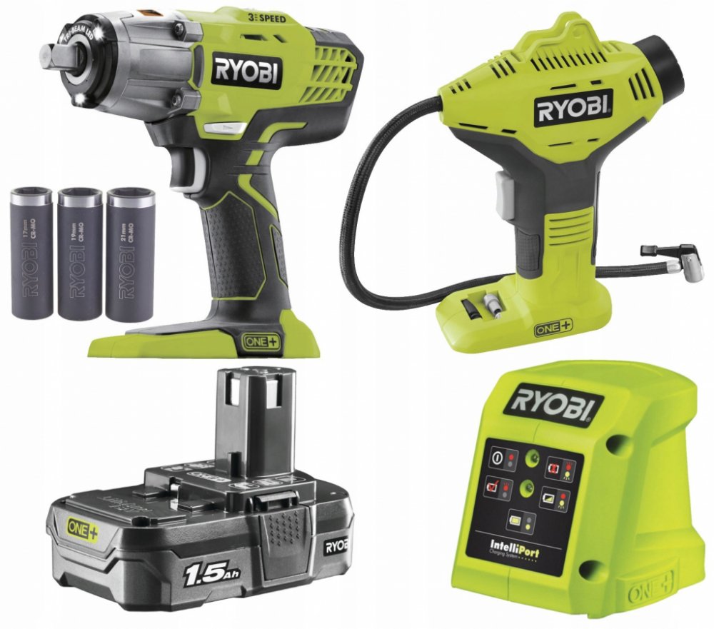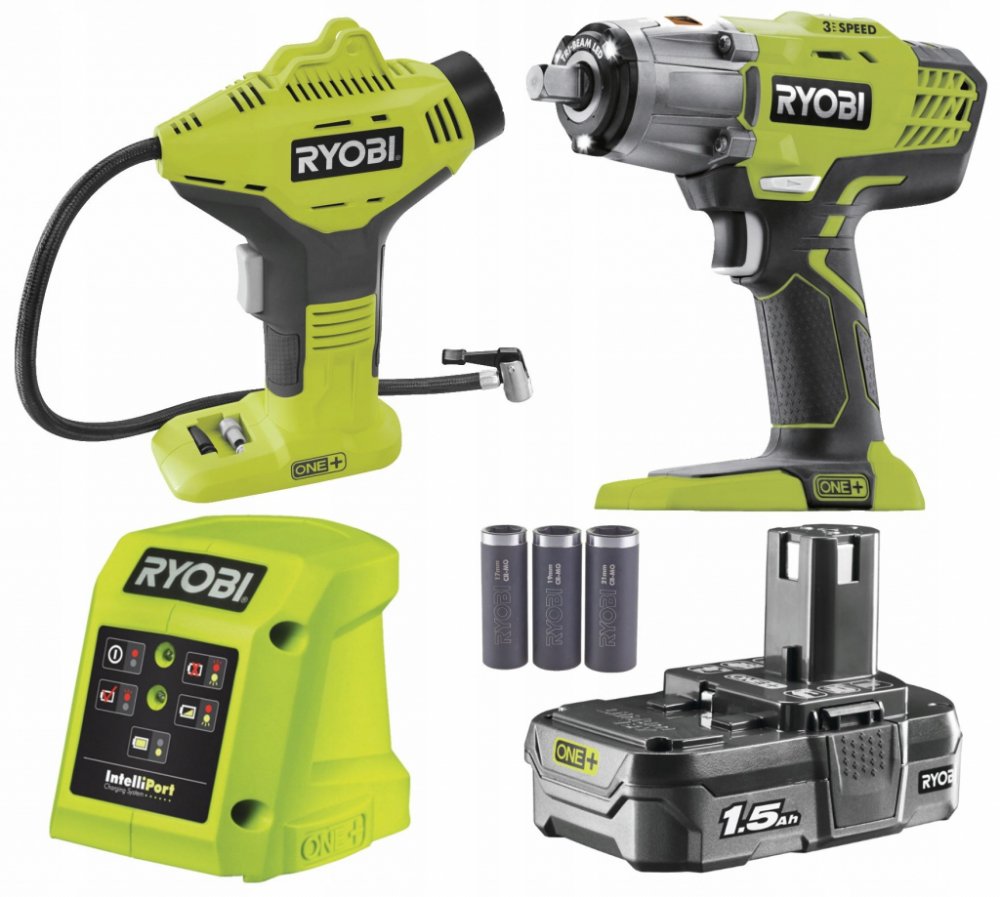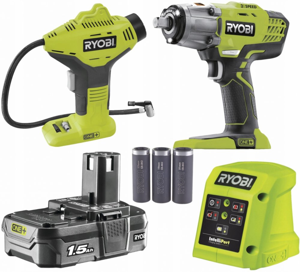 Ryobi R18IWPI-115G ONE+ sada aku nářadí 1x1.5Ah Sada aku rázového utahováku a aku kompresoru (inflátoru) s baterií a nabíječkou. motor rázového utahováku zajišťuje krouticí moment 400 Nm, se kterým zvládnete rychlé utahování a povolování matic a šroubů v náročných aplikacích nastavení tří rychlostí pro lepší kontrolu a širší využití utahováku LED světlo se 3 paprsky osvětluje pracovní plochu a eli...
