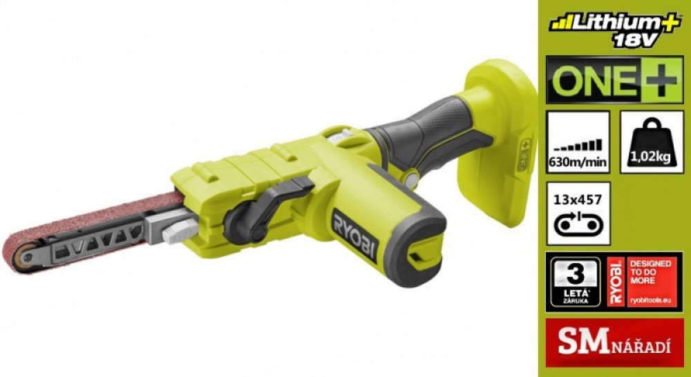 Ryobi R18PF-0 je štíhlá akumulátorová pásová bruska, ideální pro broušení a tvarování materiálů i v těch nejužších místech. Variabilní regulace otáček pohání brusný pás o rozměru 13 x 457mm, rychlostí až 630 m/min. Pro rychlou a pohodlnou výměnu brusného pásu, je bruska vybavena pákou pro jeho beznástrojovou výměnu. Bruska je součástí systému ONE +