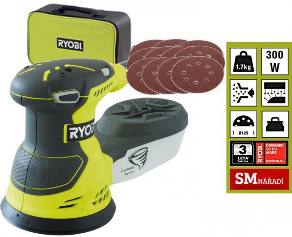 300 W 125 mm 12000 ot/min 1.7 kg Ryobi excentrické 300 W 230 V elektrické pro obecnou přípravu povrchu pro mobilní úlohy suchý zip s nízkými vibracemi a hlučností