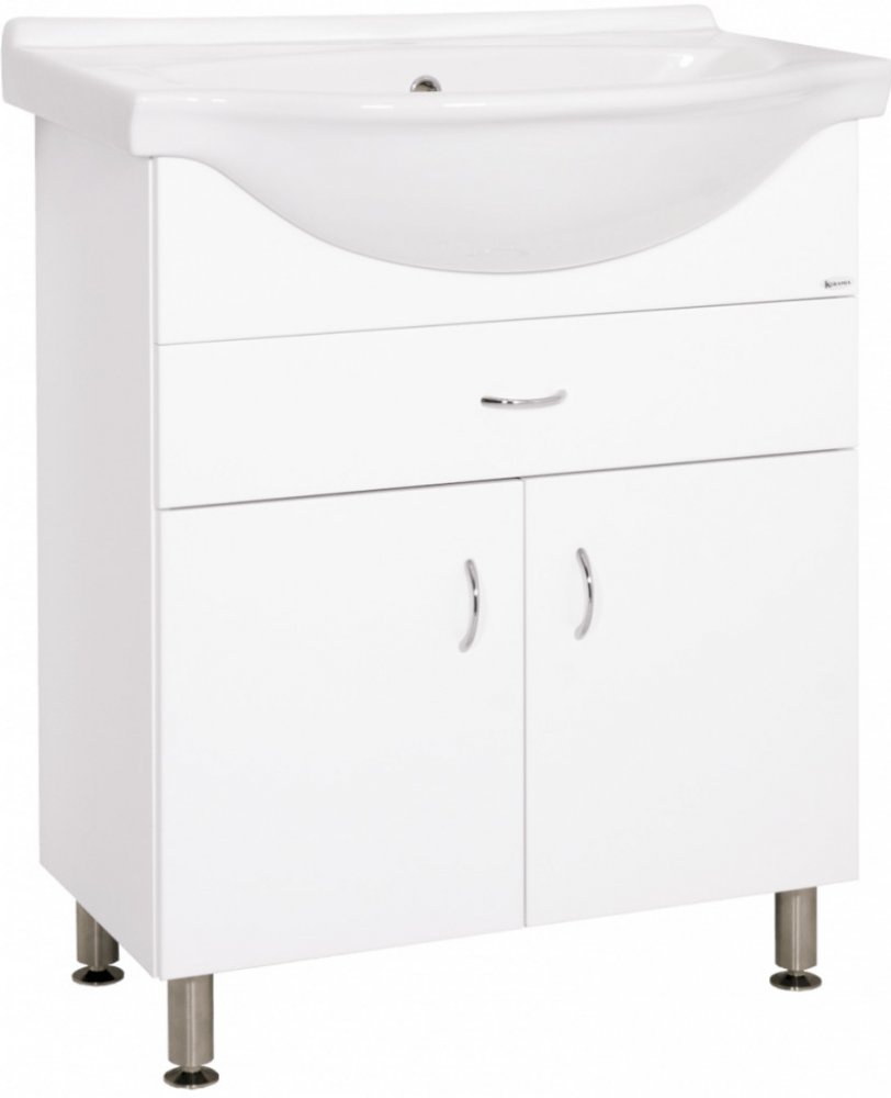 Skříňka do koupelny s keramickým umyvadlem. Lakované boky i čelo, bílá lesk. Součástí dodávky je umyvadlo, úchytky a nerezové nožičky 10 cm vysoké s možností drobné výškové úpravy. Skříňka má zásuvku rozdělenou na 2 části a 2 dvířka. Poskytuje tak dostatek úložného prostoru na např. kýbl. Skříňka je dodávána smontovaná, rychlá instalace. Doporučujeme kombinovat s doplňkovými skříňkami ze série KERAMIA PRO a zrcadly PROZRCK70IP, případně PROZRCK50IP a doplňkovou skříňkou PROH20.Ke skříňce je možné pořídit vh