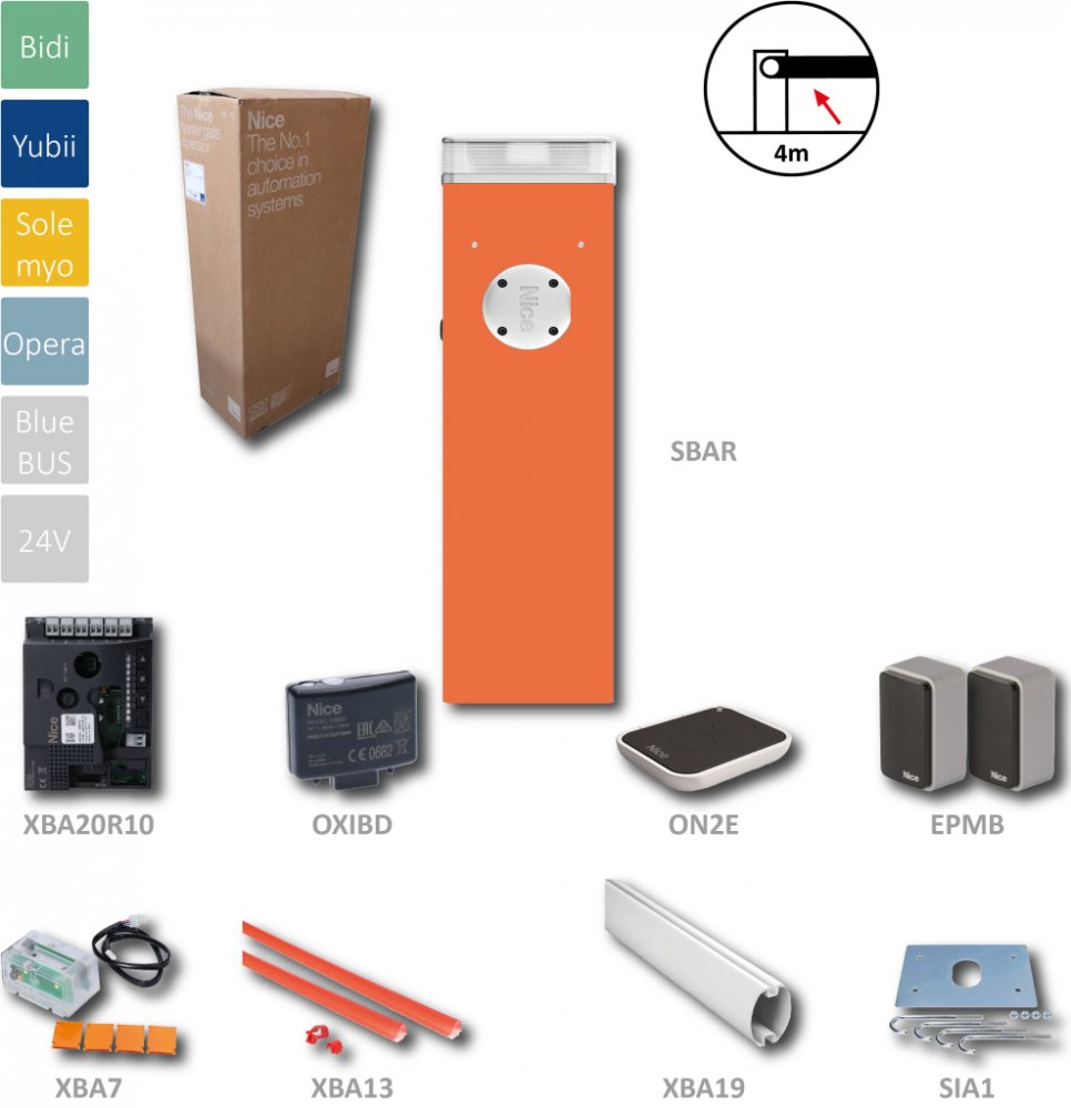 S4BAR KIT-automatická závora do 4m (24V, 300W, 100 nm) s řídící jednotkou XBA20, 1x SIA1, 1x XBA19, 1x XBA13, 1x OXIBD, 1x ON2E, 1pár EPMB, 1x XBA7