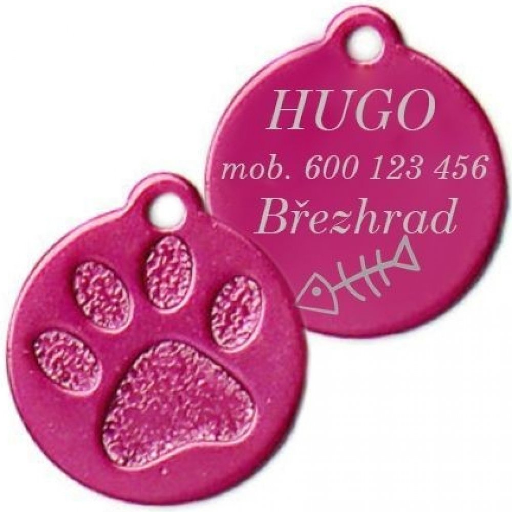 Hliníková identifikační psí známka.Za příplatek lze jednostranně opatřit destičku rytinou textu nebo drobným obrázkem.Přívěšek má povrchovou úpravu v tmavě růžové barvě.