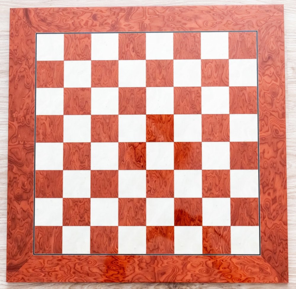 Ručně vyrobená šachovnice. Tento model kombinuje barvy výběrového červeného mořeného jasanového dřeva s čistotou bílého erárního dřeva. Její povrch je opatřen lesklým lakem, který zvýrazňuje bohatost tónů dřeva a poskytuje hladkou strukturu pro přesný pohyb šachových figurek.