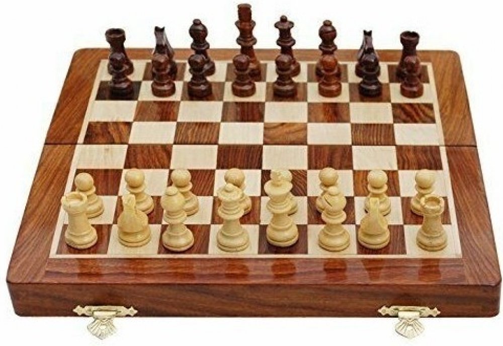 Šachovnice - kazete je skládaná ze dvou druhů dřev, figury tmavě hnědé a přírodní. Uzavíratelná na 2 místech.