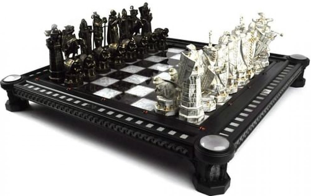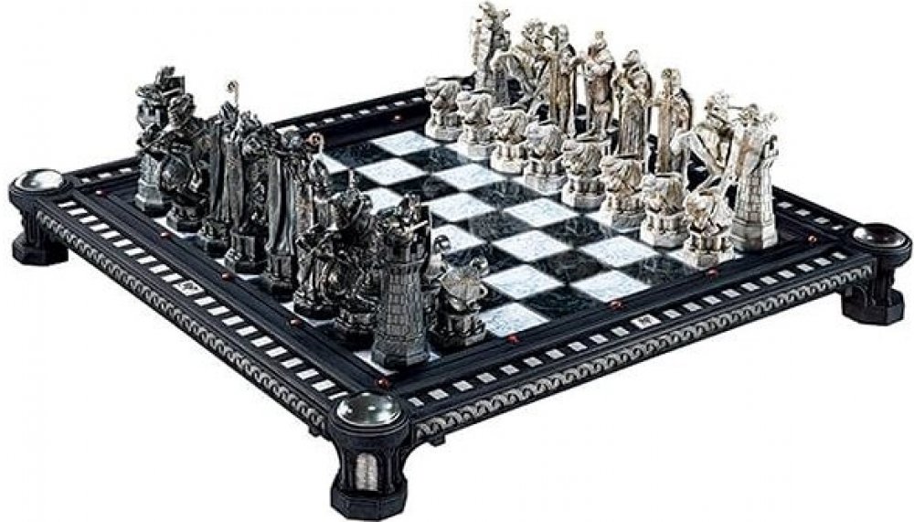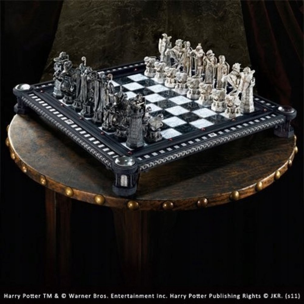 Luxusně zpracované šachy na motivy finálního úkolu z filmu Harry Potter a kámen mudrců. Balení obsahuje 32 figurek (6,5 cm - 14 cm) a hrací desku s rozměry 52 cm x 52 cm. Figurky jsou vyrobeny ze zinku, velmi detailně zpracované. Baleno ve sběratelském boxu. Váha setu 12 kg!