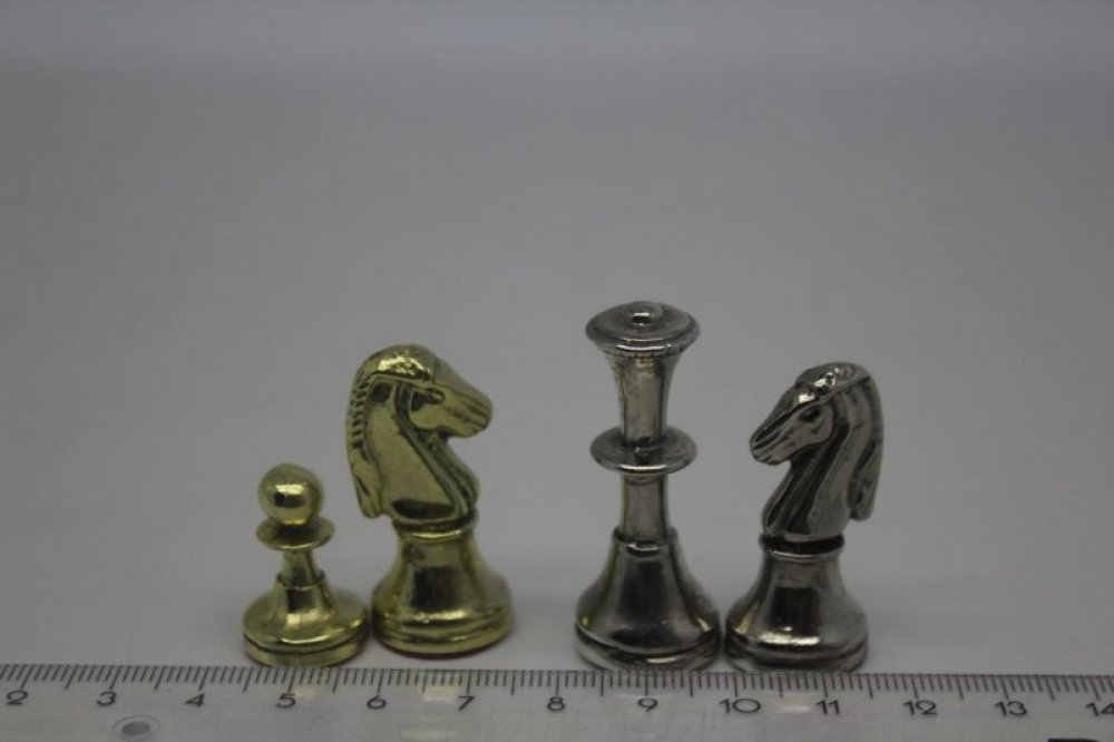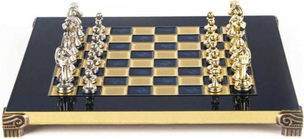 Figurky: zlaté a stříbrné kovové šachovnice zlato modrá velikost pole 2,4x2,4cm výška nejvyšší figurky cca 5cm Rozměry šachovnice: hrací 28 x 28 cm, hrací pole 20x20 cm Hmotnost: 3 kg Figurky a šachovnice jsou uloženy v černé dřevěné kazetě s kováním. manopulos cena je 148 euro