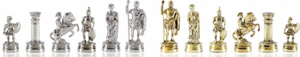 Figurky: stříbrné a zlaté Rozměry desky: 28 x 28 cm Políčko 25 mm šachovnice 16 cm a 2 cm okraj Velikost krále: 5,4 cm Hmotnost: 3,4 kg Figurky a šachovnice jsou uloženy v černé dřevěné kazetě s kováním. Období románského Řecka je charakterizováno odvážným obyvatelstvem a mezinárodními válkami. Pěšec je symbolizován jako agresivní a koně reprezentuje dravost těchto válek. Postoj Královny a Král...