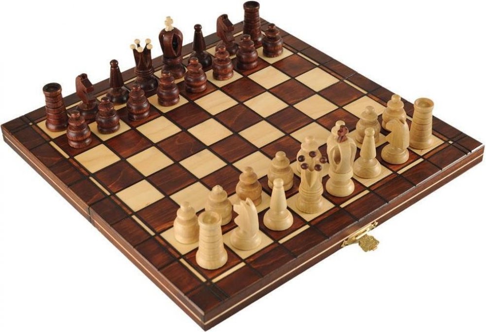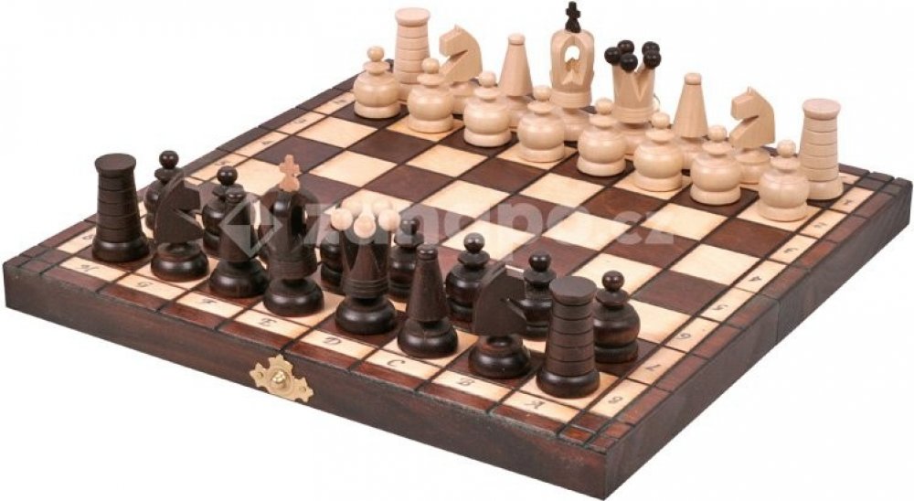 - dřevěná otevrací šachovnice s polstrovaným uložením figurek
