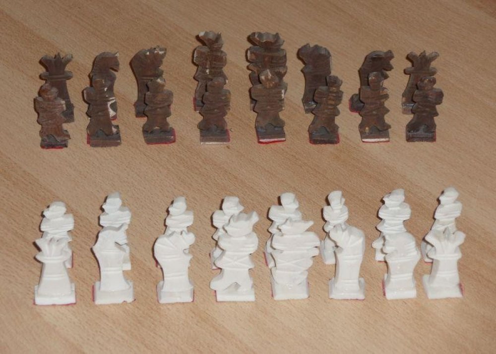 Ručně vyřezávané šachy z velbloudí kosti: Hledáte nějaké netradiční dárek? Ručně vyřezávané šachy z velbloudí kosti jsou to pravé! Netradiční vzhled figurek zaujme každého na první pohled. Výška krále: 60 mm V základní ceně jsou samotné šachy, je možné dokoupit dřevěnou nebo perleťovou šachovnici.