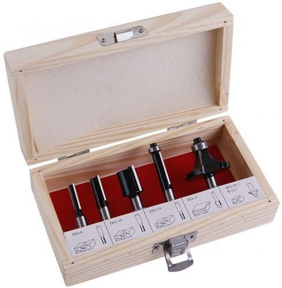 Tvarové frézy na dřevo - sada 5 ks, frézy jsou osazeny kvalitními SK plátky, různé druhy tvarových fréz bez nebo s vodícím kolečkem a kvalitním ložiskem, použití : pro frézování drážek a hran různých tvarů, stopka 8mm, balení : Dřevěný box.