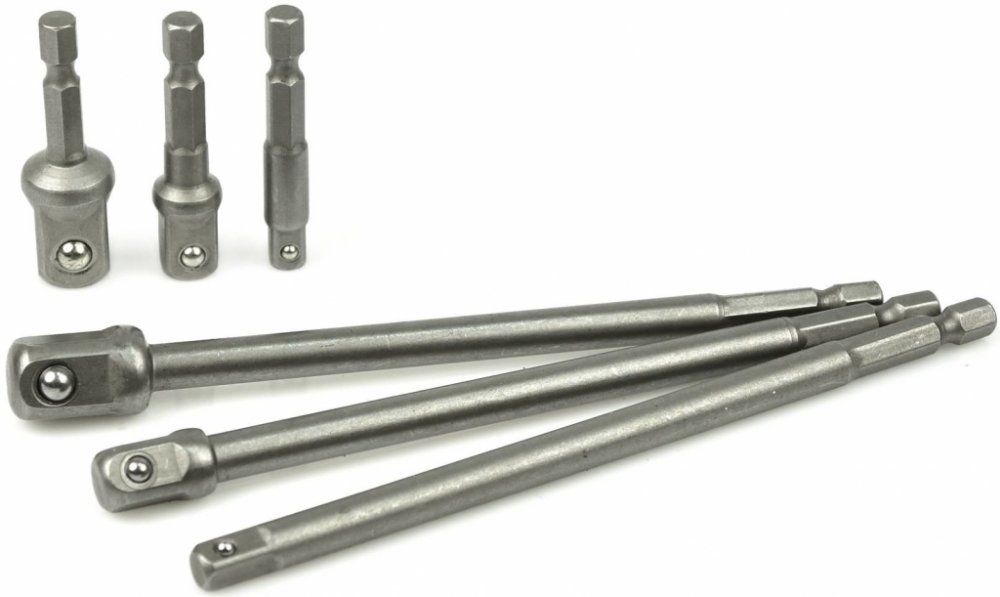 Tato sada čtyřhranných adaptérů s bezpečnostní kuličkou proti vypadnutí pro nástrčné hlavice ve dvou délkách (50 a 150 mm) a třech velikostech (1/2", 3/8" a 1/4") je vhodná do vrtaček, aku šroubováků. K upnutí do vrtačky slouží dřík HEX1/4". Vyrobeno z kvalitní CrV oceli.