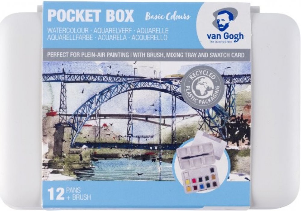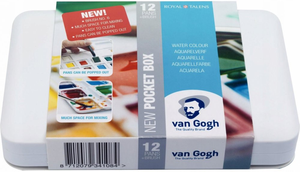 Praktická cestovní sada akvarelových barev obsahuje 12 barev v půlpánvičkách + 3 barvy navíc a skládací kulatý syntetický štětec, velikosti 6.