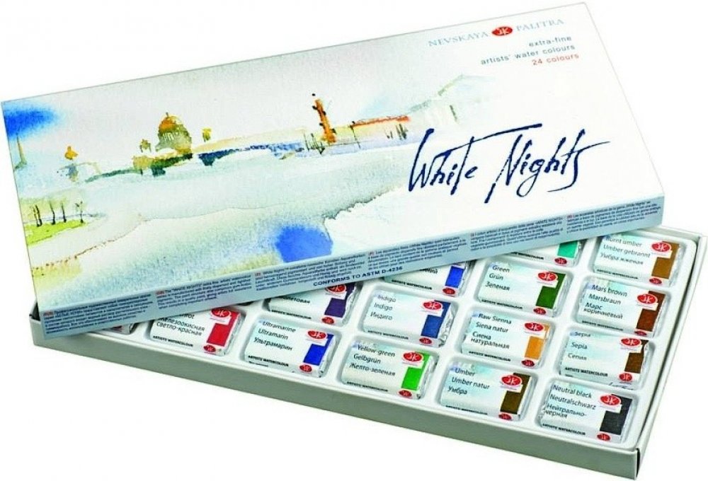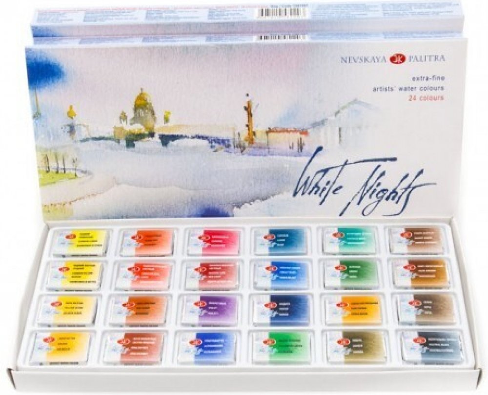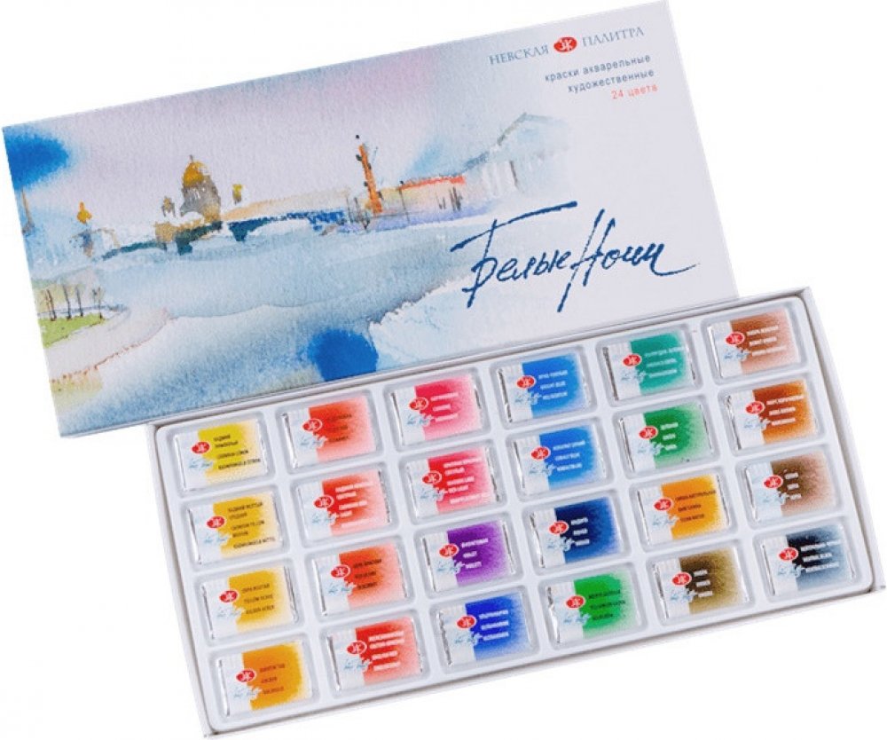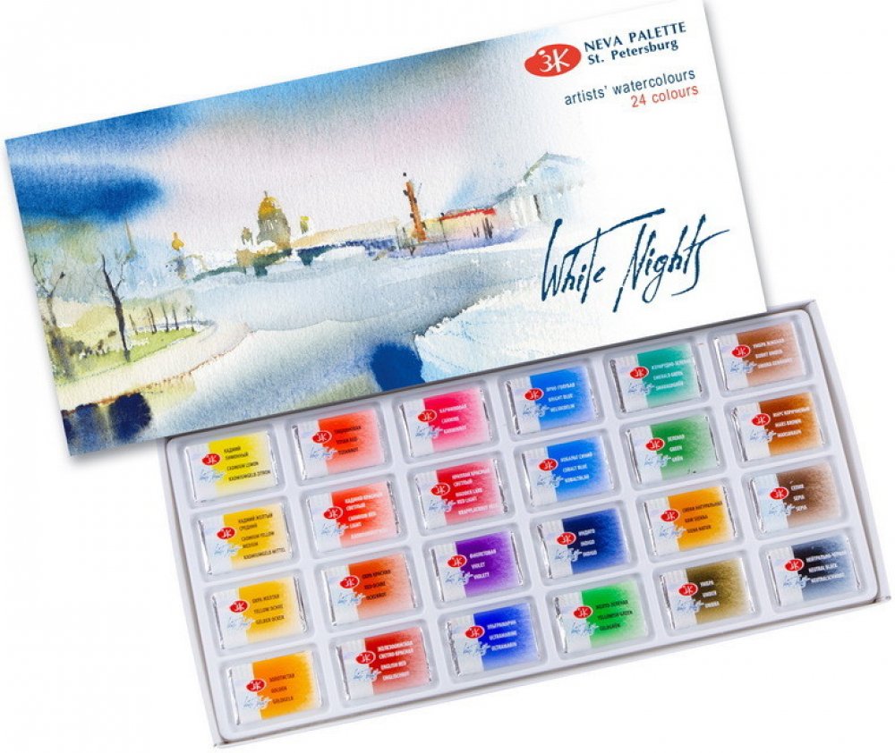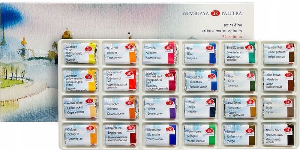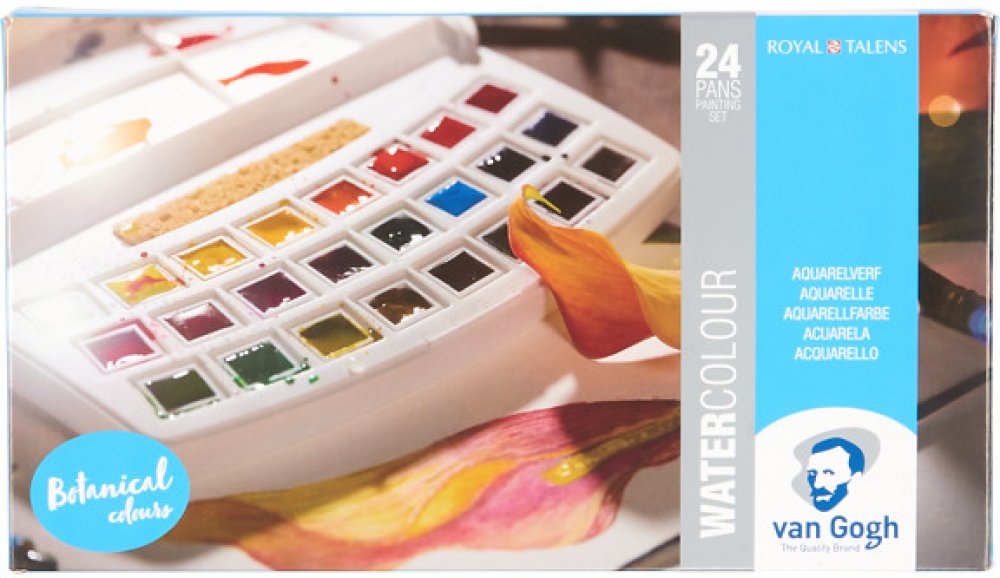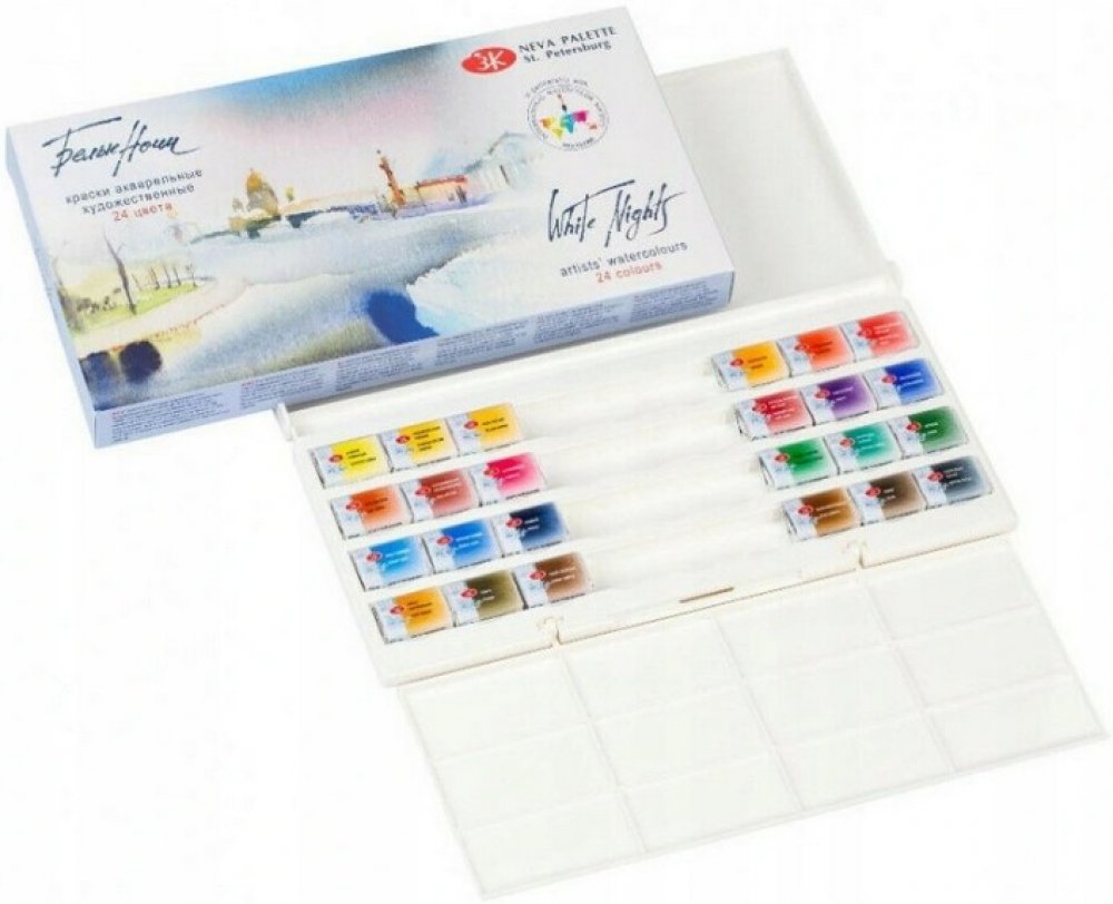 Praktická cestovní sada akvarelových barev obsahuje 24 barev v půlpánvičkách, skládací kulatý syntetický štětec, velikosti 6 a houbičku.