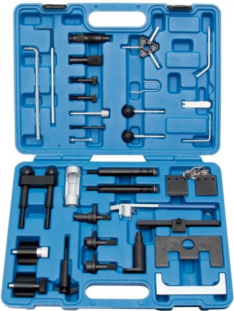 Sada aretačních přípravků je určena pro nastavování / časování rozvodů benzinových i naftových motorů vozů Volkswagen / Audi / Škoda / SEAT a využívá se také při výměnách rozvodových řemenů i dalších opravárenských úkonech. Použití benzinové motory: 1.2 (6V / 12V), 1.4 - 1.6 - 1.8 - 1.8T - 2.0 (16V) VW Lupo, Polo, Caddy, Golf, Bora, New Beetle, Passat, Sharan, Touran Audi 80, A2, A3, S3, A4, A6, TT Škoda Fabia, Octavia (od roku výroby 1996) SEAT Arosa, Ibiza, Cordoba, Leon, Toledo, Inca, Alhambra vznětové motory: 1.2, 1.4, 1.9, 2.0 TDi, 1.7, 1.9 D/TD/SDi/TDi VW Lupo, Polo, Caddy, Golf, Bora, New Beetle, Passat, Sharan, Touran, Transporter Audi 80, A2, A3, S3, A4, A6, Cabriolet Škoda Felicia, Fabia, Octavia SEAT Arosa, Ibiza, Cordoba, Leon, Toledo, Inca, Alhambra, Altea Prvky v sadě: • Přípravek na blokování klikového hřídele Audi: 1.2. 1.4, 1.9, 2.0 TDI PD, Seat: 1.4, 1.9, 2.0 TDI PD, Škoda: 1.4, 1.9, 2.0 TDI PD, VW: 1.4, 1.9, 2.0 TDI PD, 2.0 SDI. • Přípravek na fixaci vstřikovacího čerpadla Audi: 1.9, 2.5, 2.7, 3.0 TDI, 3.0 TDI CR, 1.9, 2.0 TDI PD, Seat: 1.4, 1.9, 2.0 TDI PD, 2.0 TDI PD FR, 2.0 TDI PD FT4, 1.9 SDI, 1.9 TDI, Škoda: 1.4, 1.9, 2.0 TDI PD, 1.9 TDI PD vRS, 1.9 SDI, 1.9 TDI, 2.5 TDI, VW: 1.2, 1.4, 1.9, 2.0, 3.0 TDI PD, 1.4 TDI PD BM, 1.9, 2.5, 3.0 TDI, 3.0 TDI CR, 1.9, 2.0 SDI, 1.9 TD, 1.9 D. • Nosná deska napínací kladky Audi: 1.8 Turbo, 2.0 FSI, 2.0 benzín, 1.2, 1.4, 1.9 TDI PD, Seat: 1.8 Turbo benzín, 1.4, 1.9 TDI PD, Škoda: 1.8 Turbo benzín, 1.9 TDI PD, VW: 1.8 Turbo, 2.0 V20, 1.8 GTI benzín, 1.2, 1.4, 1.9 TDI PD. • Přípravek na blokování klikového hřídele Audi: 2.8 V30, 2.7 Turbo, 4.2 V40, 4.2, 5.2 FSI, 2.4, 2.6, 2.7, 2.8, 4.2, 6.0 benzín, 2.5, 2.7, 3.0 TDI, 3.0 TDI CR, VW: 4.0 W8, 4.2 FSI, 2.8, 4.2, 6.0 benzín, 2.5, 3.0 TDI, 3.0 TDI PD, 3.0 TDI CR. • Přípravek na blokování vačkového hřídele: Audi: 2.5 TDI, VW: 2.5 TDi. • Držák předního panelu Audi:1.6, 1.8, 2.0, 2.4, 2.6, 2.8, 3.0, 4.2, 2.8 V30, 2.0 FSI, 2.0 TFSI, 1.8, 2.7 Turbo benzín, 2.0 TD. 1.9, 2.5 TDI, 1.9, 2.0 TDI PD, vw: 1.8 Turbo, 1.6, 1.8, 2.0, 2.8 benzin, 1.9 TDI PD, 1.9, 2.5 TDI. • Klíč na tlumič: 21mm. • Kolík na napínací kladku: průměr 4.4mm. • Přípravek na blokování vačkového hřídele: Audi: 1.6, 1.9, 2.0, 2.4 D, 2.0, 2.5 TD, 2.5 TDI, Seat:1.9 D, TD, TDI, 1.7, 1.9 SDI, Škoda: 1.9 D, vw: 1.3, 1.6, 2.4 D, 1.6, 1.9, 2.4 TD, 1.9, 2.5 TDI, 1.7, 1.9 SDI. • Přípravek na nastavení vačkového hřídele Audi: 1.9 SDI/TDI, Seat: 2.3 benzín, 1.9 SDI/TDI, Škoda: 1.9 SDI, VW: 1.9 SDI/TDI. • Přípravek na blokování vačkového hřídele: Seat: 1.2 V6/V12, Škoda: 1.2 V6/V12, VW: 1.2 V6/V12 benzín. • Přípravek na blokování klikového hřídele: Seat: 1.2 V6/V12, Škoda: 1.2 V6/V12, VW: 1.2 V6/V12 benzín. • Přípravek na blokování klikového hřídele: Audi: 1.9, 2.0 TDI PD, Seat: 1.9, 2.0 TDI PD, Škoda 1.9, 2.0 TDI PD, VW: 1.9, 2.0 TDI PD. • Napínák rozvodového řetězu Audi: 1.8 Turbo, 1.8, 2.0, 3.7, 4.2, Seat: 1.8 Turbo, 1.4, 1.6 V16, 1.8 Cupra R, 1.4, 1.8, 2.3 benzín, 1.9, 2.0 TDI PD, 1.7, 1.9 SDI, Škoda: 1.8 Turbo, 1.8 Turbo V20 RS benzín, VW: 1.8 Turbo, 2.0 v20, 1.8 benzín. • Napínák klínové řemenice (nastavitelný). Modely vozidel: • Audi: 80, 80 Quattro, 90, 100, 100 Quattro, 200, A2, A3, A4, A4 Cabrio, A4 Quattro, A6, A6 Quattro, A6 Allroad, A8, Allroad, Q7, R8, RS4, RS6, S4, S4 Cabrio, S5, S5 Cabrio, S6, S8. • Seat: Alhambra, Altea, Altea XL, Arosa, Cordoba, Ibiza, Inca, Leon, Toledo. • Škoda: Fabia I-II, Felicia, Felicia Van, Felicia Pick-up, Octavia I-II, Octavia Tour, Roomster, Superb. • VW: Beetle, Bora, Caddy, Caddy Maxi, Caddy Pick-up, Eos, Fox, Golf, Jetta, Lupo, Passat, Phaeton, Polo, Polo Classic, Sharan, Santana, Tiguan, Tuareg, Touran, Transporter, Vento. Kódy motorů: • Audi: 1T, 1Y, 1Z/AHU, 3D, AAH, AAS, AAT, AAZ, ABC, ABP, ACK, ADP, ADR, AEB, AEL, AFB, AFF, AFN, AFV, AGA,AGB, AGE, AGP, AGR, AHF, AHH, AHL, AHU, AJG, AJK, AJL, AJM, AKE, AKN, ALF, ALG, ALH, ALT, ALW, ALZ, AMB, AMF, AML, AMM, AMX, ANA, ANB, ANK, ANY, APC, APR, APS, APT, APU, APZ, AQD, AQF, AQH, AQJ, AQM, ARE, ARG, ARJ, ARM, ARN, ARS, ARU, ASB, ASE, ASG, ASJ, ASM, ASV, ASY, ASZ, ATD, ATJ, ATL, ATX, AUW, AVB, AVF, AVG, AVJ, AVN, AVV, AWA, AWN, AWT, AWX, AWY, AXR, AYM, AZA, AZB, AZC, AZQ, AZR, BAR, BAS, BAT, BAU, BBK, BCY, BCZ, BDG, BDH, BDV, BES, BEX, BFB, BFC, BGB, BHC, BHF, BKC, BKE, BKN, BLB, BMD, BME, BMK, BMZ, BNA, BNG, BNS, BPG, BPJ, BPP, BPW, BRB, BRC, BRD, BRE, BRF, BRV, BSB, BSG, BSM, BTH, BUG, BUH, BUL, BUN, BVA, BVF, BVG, BVJ, BWE, BXA, BYH, BZG, CAPA, CAUA, CN, CY, DE, JK, NC, RA, SB, Z1. • Seat: 1Y, 1Z, AAZ, AEY, AFN, AGP, AGR, AGZ, AHF, AHU, AKW, ALH, AMF, ANU, AQM, ARL, ASV, ASY, ASZ, ATD, AUY, AVG, AWY, AXR, AYQ, AZQ, AZV, BBU, BJB, BJX, BKC, BKD, BKV, BLS, BLT, BLZ, BMD, BME, BMM, BMN, BMS, BMT, BNM, BNV, BPX, BRT, BSW, BTB, BUK, BVH, BVK, BXE, BZG. • Škoda: ABV, AEF, AGP, AGR, AHF, AHL, ALH, AMF, AQM, ASV, ASY, ASZ, ATD, AVB, AVF, AWX, AXR, AYM, AZV, BDG, BJB, BKC, BKD, BLS, BLT, BMM, BMS, BNM, BNV, BSW. • VW: 1G, 1S, 1V, 1W, 1X, 1Y, 1Z, 1Z/AUH, AAB, AAZ, ABL, ACK, ACL, ACT, ACV, ADP, ADR, AEB, AEF, AEY, AFB, AFN, AGD, AGE, AGP, AGR, AHB, AHD, AHF, AHG, AHH, AHL, AHU, AHY, AJA, AJM, AJT, AKD, AKN, AKU, AKW, ALE, ALG, ALH, ALT, ALZ, AMF, AMX, ANA, ANB, ANJ, ANU, ANY, APA, APR, APT, APU, AQD, AQM, ARG, ARL, ARM, ASV, ASX, ASY, ASZ, ATD, ATJ, ATU, ATX, AUF, AUH, AUY, AVB, AVF, AVG, AVQ, AVR, AWF, AWG, AWT, AWX, AWY, AXB, AXC, AXG, AXL, AXQ, AXR, AYC, AYQ, AYZ, AZM, AZQ, AZV, AZV, BAN, BAP, BAR, BAU, BAY, BBE,BBF, BBG, BDH, BDJ, BDK, BDN, BGW, BHW, BHX, BJB, BJJ, BJK, BJM, BJN, BJX, BJZ, BKC, BKD, BKP, BKS, BLS, BLT, BMA, BMD, BME, BMK, BMM, BMN, BMP, BMR, BMS, BMT, BNM, BNV, BRM, BRN, BRP, BRR, BRS, BRT, BRU, BST, BSU, BTB, BTT, BUK, BUN, BUZ, BVE, BVK, BVW, BWB, BWV, BXE, BXF, BZG,CARA, CASA, CASB, CR, CS, CY, DV, DW, JK, JP, JR, JX, KY, ME, M