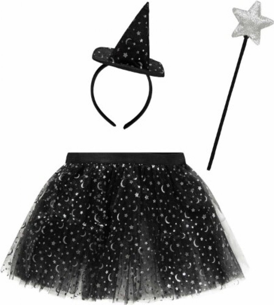 Velikost: One size (děti 3–8 let)Obsah balení: Sukně, čelenka s kloboučkem, hůlkaMateriál: Textil, plastBarva: Černá se stříbrným potiskemBalení: 1 sada