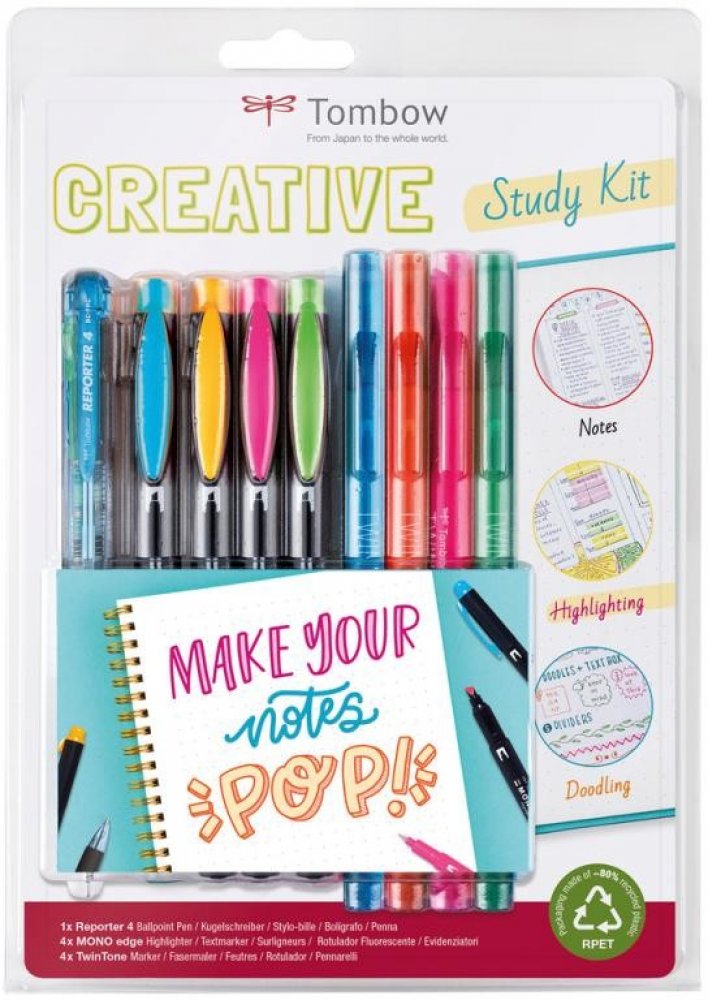 Kreativní studijní sada obsahuje výběr vysoce kvalitních produktů Tombow, které vašim zákazníkům pomohou při studiu a pomohou jim se sebeorganizací. S přiloženými pery mohou kreativně navrhovat své poznámky. Sada obsahuje QR kód, který poskytuje vašim zákazníkům přístup k tipům a trikům pro sebeorganizaci a používání propisek. Balení obsahuje: 1x kuličkové pero Reporter 4, 4x zvýrazňovač MONO s dvojitým hrotem, 4x pera s vláknovým hrotem TwinTone.