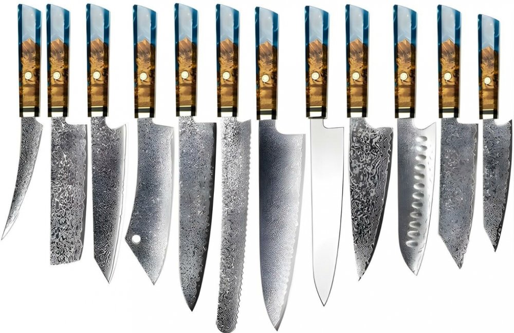 Exkluzivní sada damaškových kuchyňských nožů určená pro náročné uživatele i profesionální kuchaře. Čepele jsou vyrobeny ze 67vrstvé damaškové oceli s jádrem z oceli 10Cr15CoMoV, která poskytuje mimořádnou ostrost, vysokou tvrdost a dlouhou životnost ostří. Rukojeti z javorového dřeva v kombinaci s modrou pryskyřicí dodávají nožům jedinečný vzhled, perfektní vyvážení a pohodlné držení při práci.