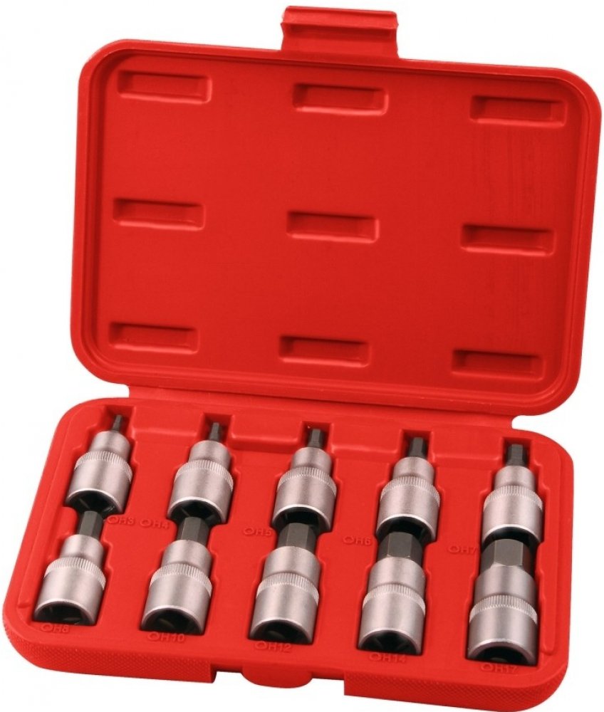 Sada 10ks zástrčných hlavic, Imbus, 1/2" x 55mm, HEX 3-4-56-7-8-10-12-14-17mm, materiál chrom-vanadová ocel (CrV), S2 ocel. Sada obsahuje: 1/2" x 55mm Zástrčné hlavice: HEX 3-4-5-6-7-8-10-12-14-17mm Materiál: chrom-vanadová ocel (CrV), S2 ocel