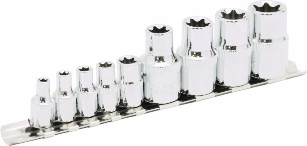 Sada nástrčných hlavic TORX. Všechny části jsou vyrobeny z chrom-vanadiové oceli kováním, dobře kombinovaná sada v přehledném kovové organizéru.