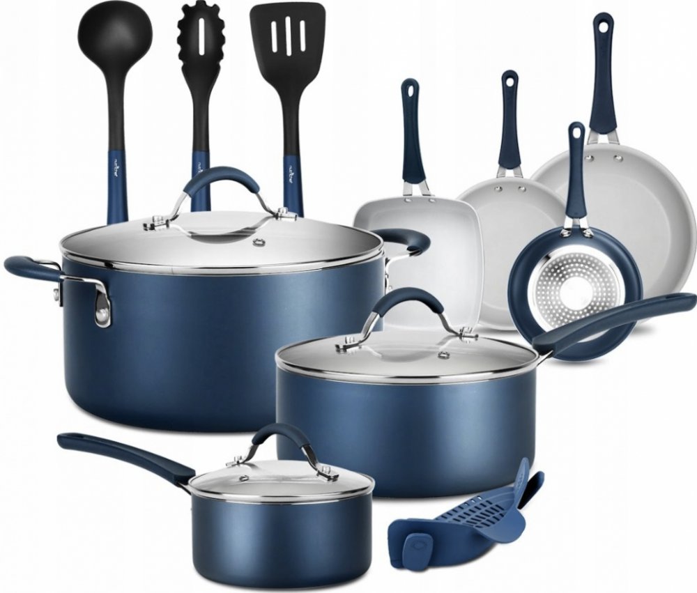 ➡ SADA 14 PRVKŮ: NutriChef nabízí 14-dílnou sadu kuchyňského nádobí s nepřilnavým povrchem, která obsahuje hrnce o objemu 1,5 l a 2,5 l s pokličkami, 5 l pekáč s poklicí, velkou pánev 12“, střední pánev 10“, malou pánev 8“, naběračku, vidličku na těstoviny, špachtli a sítko.