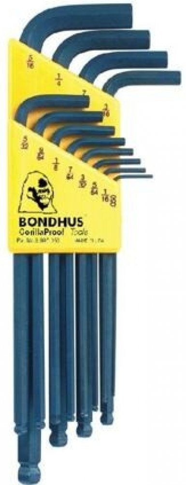 Sada imbusových klíčů s kuličkou. Kulové zakončení imbusových L-klíčů značky BONDHUS umožňuje práci pod úhlem až 25 stupňů Klíče jsou vyrobeny z oceli Protanium, která je až o 20% pevnější než běžné druhy oceli. Sada je opatřena pouzdrem Bondhex. Každý klíč a pole sady je označeno rozměrem, což umožňuje rychlé, pevné a bezpečné uložení každého klíče. Klíče jsou v pouzdru uzamčeny pootočením, což brání jejich uvolnění. Pouzdro lze použít i při šroubování ke zvětšení páky. Rozměry: 050", 1/16", 5/64", 3/32",7/64", 1/8", 9/64", 5/32", 3/16", 7/32", 1/4", 5/16".