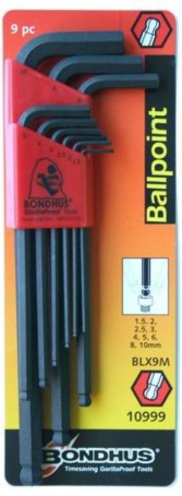 9-ti dílná sada imbusových klíčů s kuličkou PRO Guard (metrická) BONDHUS c Sada je opatřena pouzdrem Bondhex. Každý klíč a pole sady je označeno rozměrem, což umožňuje rychlé, pevné a bezpečné uložení každého klíče. Klíče jsou v pouzdru uzamčeny pootočením, což brání jejich uvolnění. Pouzdro lze použít i při šroubování ke zvětšení páky. 9 dílů / metrika Rozměry:1,5mm, 2mm, 2,5mm, 3mm, 4mm, 5mm, 6mm, 8mm, 10mm.