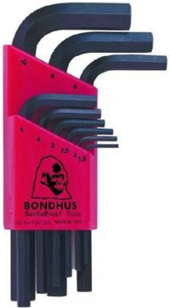 9 dílná sada imbusových klíčů Rozměry: 1,27mm, 1,5mm, 2mm, 2,5mm, 3mm, 4mm, 5mm, 6mm, 8mm, 10mm. Klíče jsou vyrobeny z oceli Protanium, která je až o 20% pevnější než běžné druhy oceli. Sada je opatřena pouzdrem Bondhex. Každý klíč a pole sady je označeno rozměrem, což umožňuje rychlé, pevné a bezpečné uložení každého klíče. Klíče jsou v pouzdru uzamčeny pootočením, což brání jejich uvolnění. Pouzdro lze použít i při šroubování ke zvětšení páky.