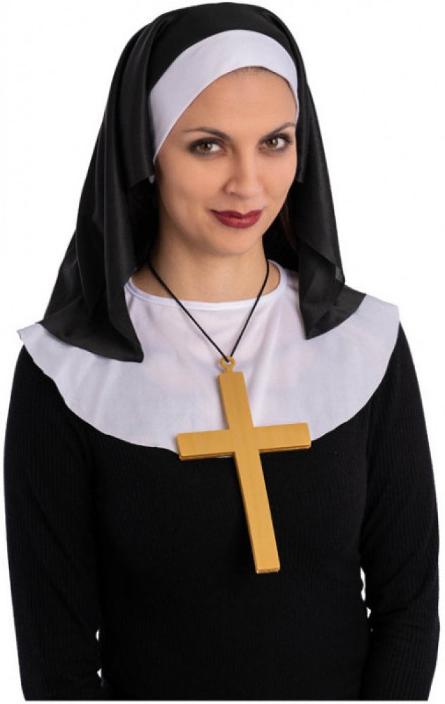 Sada jeptišky (čepec, límec, náhrdelník s křížem) Skládá se z černého látkového čepce, bílého látkového límce a plastového krucifixu. Ideální sada ke kostýmu jeptišky na maškarní plesy nebo karneval Velikost: Dospělá Materiál: Polyester