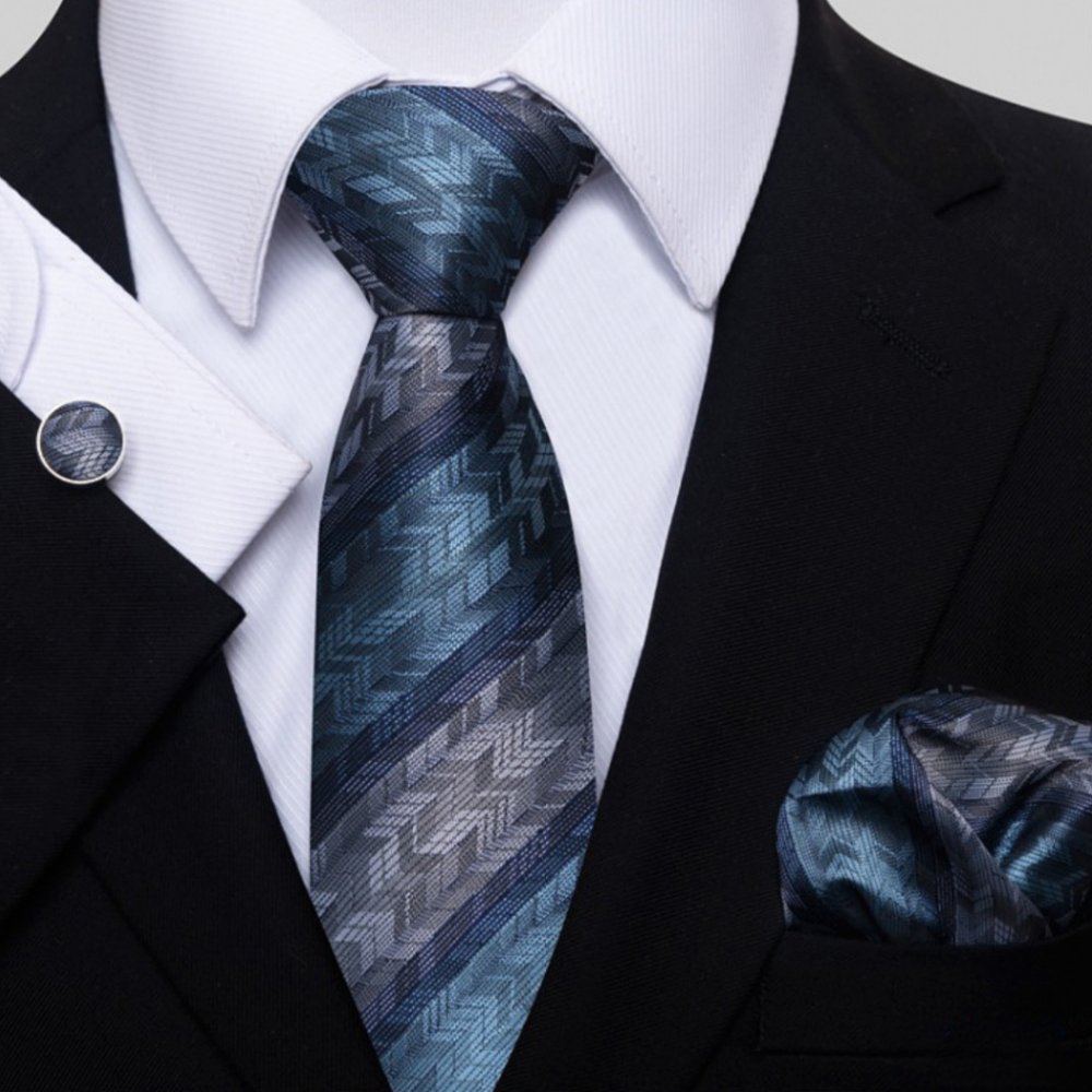 Elegantní pánská souprava obsahuje kravatu, kapesníček a manžetové knoflíčky, vše ve stejném barevném i materiálovém provedení. Kravata je velmi příjemná na dotek, dělá dobrý dojem. Manžetové knoflíčky se nosí ke košilím, které mají zesílené lemy rukávů.