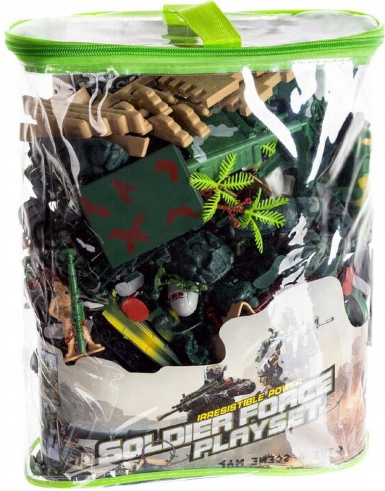 Tento neobvyklý set se skládá z velmi velkého množství prvků. Sada obsahuje: vojáky, zbraň, tanky, letadlo, operace, budovy, sítě, stromy a mnoho dalších doplňků, které umožní vytvořit jedinečnou scenérii války. Hračka se skvěle hodí jak doma během deštivých dnů, tak i venku, např. v parku nebo na hřišti. Sada je umístěna v uzavíratelném pouzdro s rukojetí, což umožní snadné skladování a přepravu.