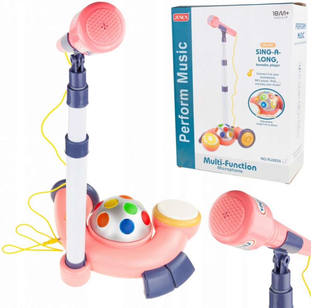 Mikrofon pro děti s nastavitelným stojanem pro malé hvězdy má 4 druhy zvuků bicích, 12 různých tanečních rytmů na výběr a blikající světla diskotékové koule. Karaoke stroj se připojuje k MP3 přehrávačům nebo mobilním zařízením pomocí audio kabelu (součástí balení), takže děti mohou zpívat nebo poslouchat své oblíbené písničky. Zajistěte svým dětem mnohem více zábavy.