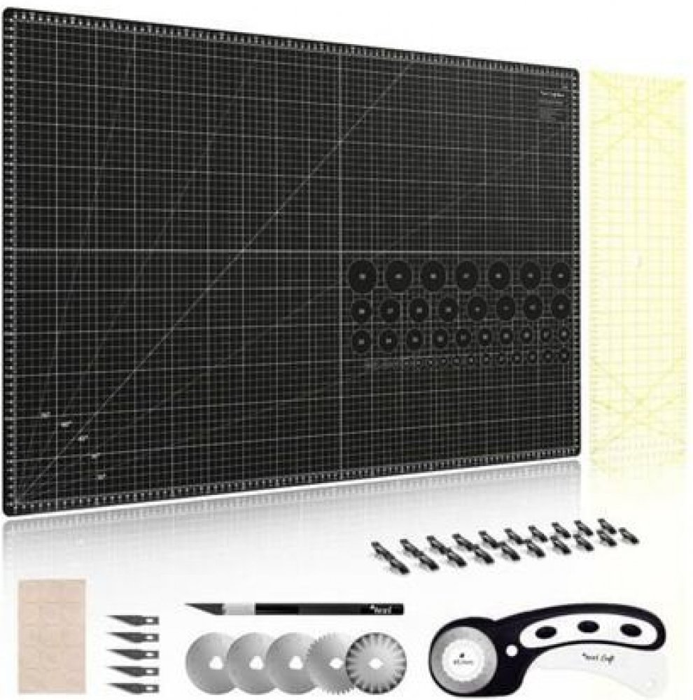 Sada na patchwork a šití Texi Craft černá 90x60 je sestava ve které najdete vše co byste mohli potřebovat pro patchwork. Sada pro řezání je velká 90 x 60 cm a s přehledem s ní uskutečníte malé i střední projekty. Tato sada umožňuje přesnější měření a usnadňuje následné řezání. Sada na patchwork obsahuje samosvornou řezací podložku, řezacího kolečko i s náhradními čepelemi, skalpel také s náhradními čepelemi, pravítko, kolíky a prostiskluzové samolepky. Sada na patchwork obsahuje: 5vrstvá řezací podložka se stupnicí v centimetrech/palcích Podložka s vyznačenými úhly a rovnoběžnými čarami, velikost: 90 x 60 cm. Je vyrobena ze speciálního materiálu, který se po řezání uzavře a podložka zůstane hladká. Oboustranná, což navíc prodlužuje její životnost. Ideální pro řezání patchworkových prvků. Řezací kolečko 45 mm Pro vyřezávání prvků v různých typech řemeslných projektů (patchwork, vyřezávání z papíru, látek, kůže, vinylu). 45 mm čepel z vysoce kvalitní oceli, odolná a velmi ostrá. Tvarovaná rukojeť s měkkým polštářem, perfektně padne do ruky. Bezpečnostní zámek a kryt čepele. K dispozici jsou vyměnitelné čepele. Umožňuje přesné a důkladné řezání prvků vyrobených z látek, kůže, kůže a papíru. Skalpel s extra čepelemi Skalpel je ideální pro velmi jemnou řemeslnou práci. S vysokou přesností řeže nejrůznější materiály, jako je papír, lepenka, textilie, kůže, fólie, guma, tapety, linoleum atd. Díky žebrovanému povrchu rukojeti a protiskluzové plastové úchopové zóně se skalpel velmi dobře drží v ruce. Skalpel je dodáván s 5 vyměnitelnými noži a obsahuje ochrannou čepičku. Pravítko pro patchwork a quiltování Patchwork, quiltování, netradiční projekty? Při každé tvůrčí práci budete potřebovat trochu přesnosti, kterou vám poskytnou naše pravítka. Sada 20 kolíků na materiál Díky nim zajistíte materiál proti sklouznutí. 15 kusů protiskluzových samolepek Specifikace: Kartonová krabice pro skladování Standardní samosvorná plastová podložka Rozměry podložky: 90 x 60 cm Tloušťka podložky: 3 mm Pravítko Rozměry pravítka: 15 x 60 cm Řezací kolečko Různé typy čepelí: 5 ks Průměr čepele nože: 45 mm Skalpel Náhradní čepele: 5 ks Klipy: 20 ks Protiskluzové samolepky: 15 ks