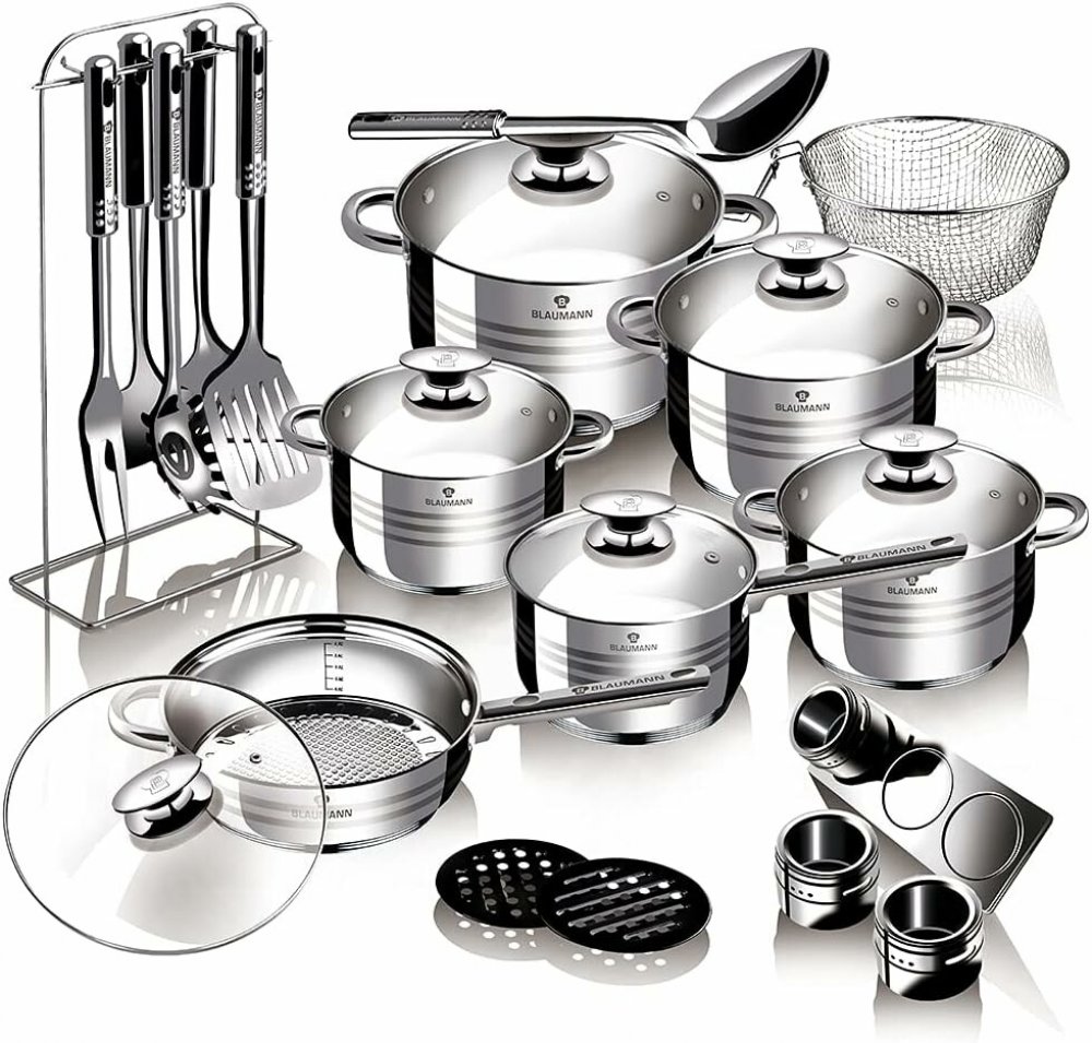 - materiál: nerezová ocel - obsahuje: kastrol s poklicí 24 x 14,5 cm, 20 x 12,5 cm, 18 x 11,5 cm, 16 x 10,5 cm - rendlík s poklicí 16 x 10,5 cm - pánev s poklicí 24 x 6,5 cm - sada kuchyňského náčiní 7 ks se stojanem - sada kořenek 3 ks na magnetickém tácku- 2 ks podložek pod horké hrnce- fritovací košík s odnímatelnou rukojetí - 5ti vrstvé dno - nýtované rukojeti pro bezpečné používání - vhodné na všechny typy sporáků včetně indukčních - vhodné do myček - odměrná stupnice - nerezové rukojeti a úchyty
