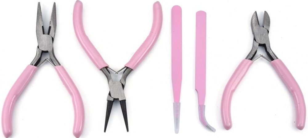 Sada 3 druhů kleští a 2 pinzet z oceli s růžovými ručkami, vše v praktickém pouzdře.