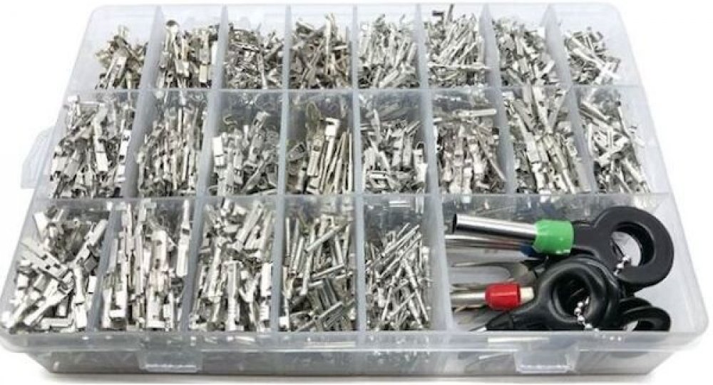 Sada 1980 ks pinů do autokonektorů včetně extraktorů.Typy: 1 / 1,5 / 1,8 / 2,2 / 2.8 / 3,5 mm1 set vytahováků pinů 18 typů.100 ks 1.5mm zdířka DJ623-E1.5A100 ks 1.5mm konektor DJ615B-1.5100 ks1.5mm zdířka DJ621–1.5B100 ks 1.5mm konektor DJ611–1.5B100 ks 1.5mm zdířka DJ627–1.5A100 ks 1.5mm konektor DJ617–1.5A100 ks 1.5mm zdířka DJ224B-1.0A100 ks 1.5mm konektor DJ214B-1.0A100 ks 1.8mm zdířka DJ621F-...