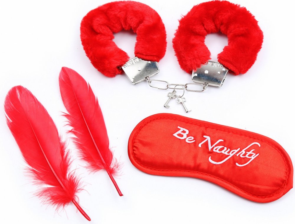 Sada pro smyslné hrátky – hebká pouta, maska a peříčka