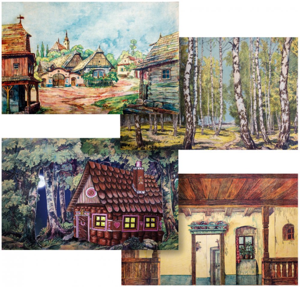 2x oboustranné papírové pozadí pro loutkové divadlo 14 cm Vesnice Les Perníková chaloupka Světnice 42x26 cm