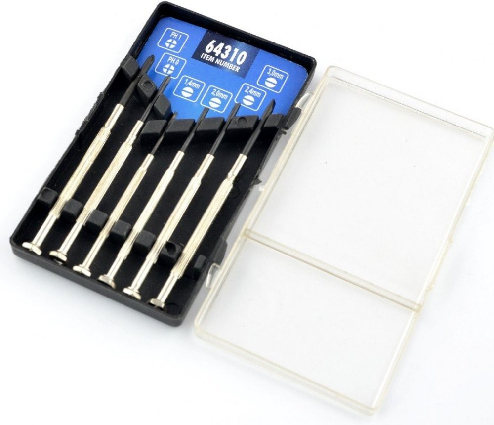 Univerzální sada obsahující 6 různých přesných šroubováků. Vše je zabaleno v kazetě.