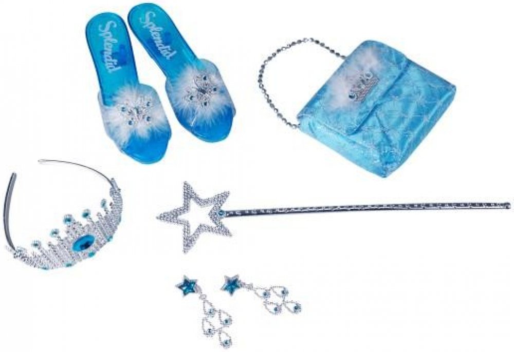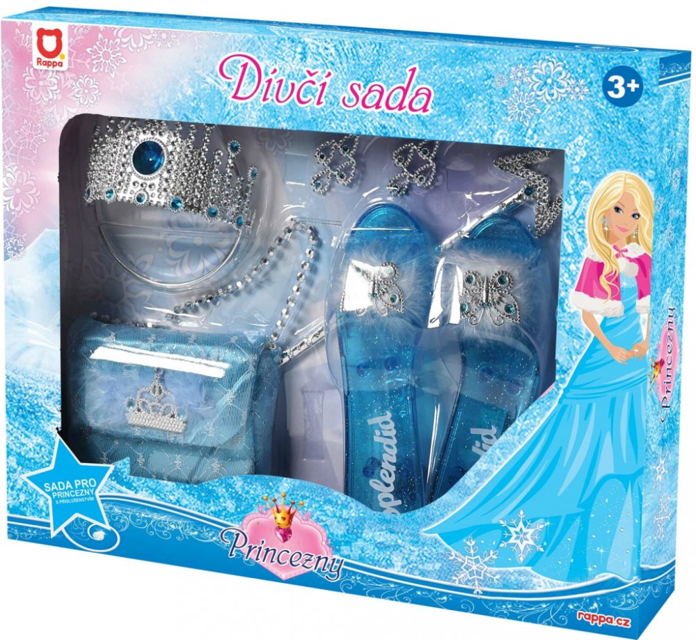 Která z holčiček by nezatoužila poté, stát se alespoň na chvíli krásnou princeznou! Set obsahuje střevíčky, kabelku, čelenku, korunku, náušnice a hůlku. Všechny prvky této sady jsou perfektní doplňky ke kostýmu. Velikost střevíček je cca 19 cm. Doporučeno pro dívky od 3 let.
