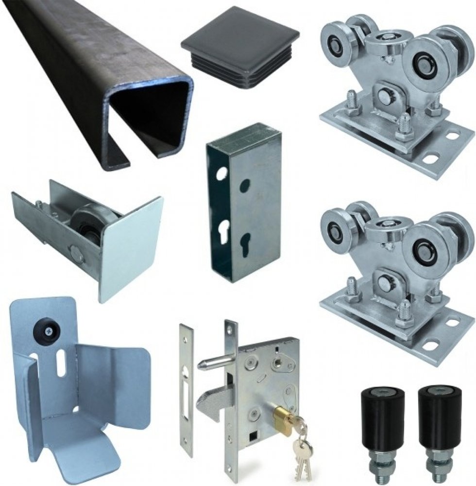 Sada obsahuje:1x hákový zámek s protikusem 1x kryt zámku 2x stavitelný kyvný zinkovaný vozík 70mm 1x dojezdové kolo na bránu 1x dojezdová kapsa 2x plastová záslepka C profilu 2x horní vodící rolna 6m nosného C profilu Fe 70x70mm, tl. 4 mm