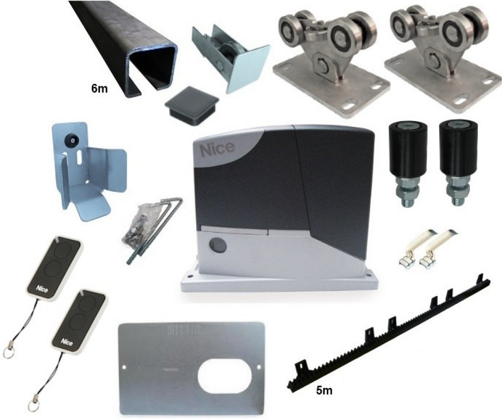 Kompletní sada se zinkovaným profilem pro výrobu samonosné posuvné brány s průjezdem max. 4,5m a hmotností max. 350kg, vybavená pohonem NICE ROAD-400 od předního výrobce kvalitní bránové automatizační techniky.