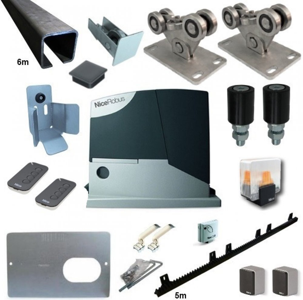 Kompletní sada se zinkovaným c-profilem pro výrobu samonosné posuvné brány s průjezdem max. 4,5m a hmotností max. 350kg, vybavená pohonem NICE ROBUS-400 od předního výrobce kvalitní bránové automatizační techniky.