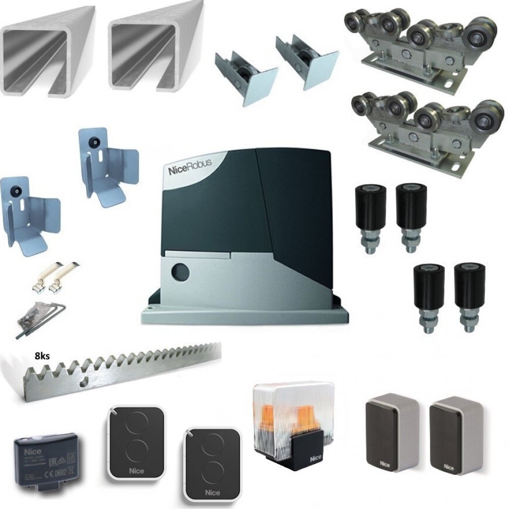 Kompletní sada se zinkovaným c-profilem pro výrobu samonosné posuvné brány s průjezdem max. 7m a hmotností max. 500kg, vybavená pohonem NICE ROBUS-1000 od předního výrobce kvalitní bránové automatizační techniky.