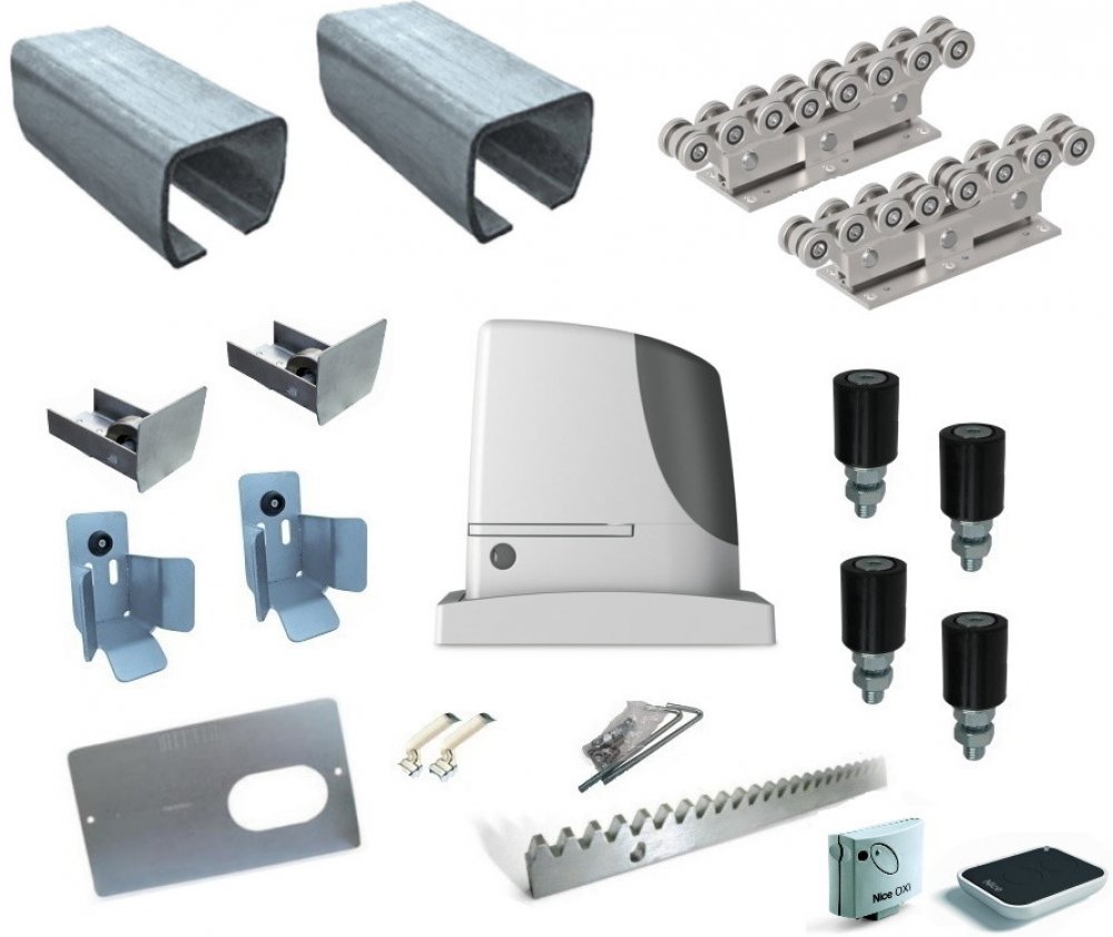 Kompletní sada se zinkovaným prodilem pro výrobu automatické samonosné posuvné brány s průjezdem max. 8m a hmotností max. 700kg, vybavená pohonem NICE RUN1800 od předního výrobce kvalitní bránové automatizační techniky.