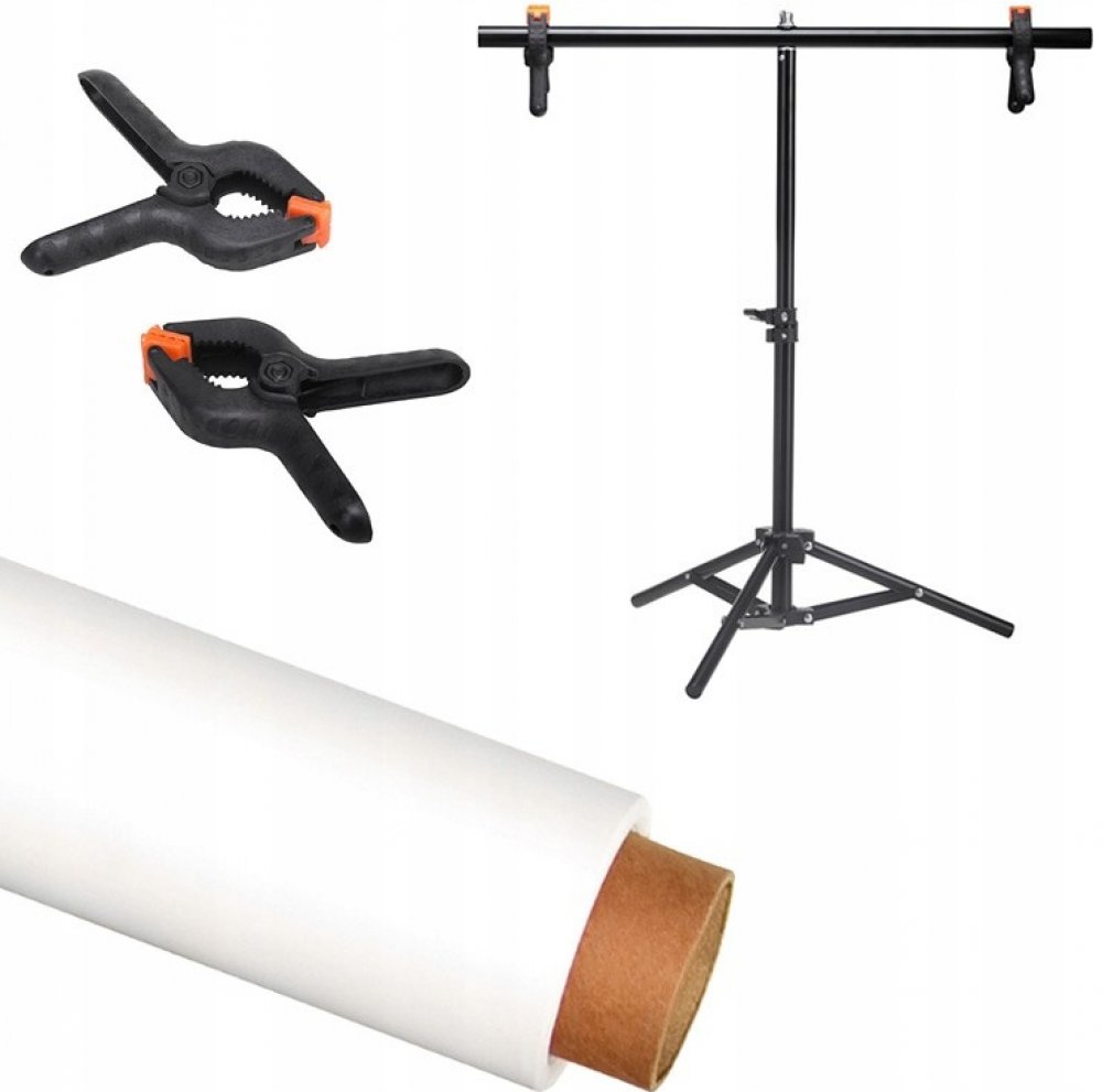 Stojan na pozadí ateliér 70 cm rameno 60 cm + bílé kartonové pozadí 0,5 x 1,5 m + 2 klipy