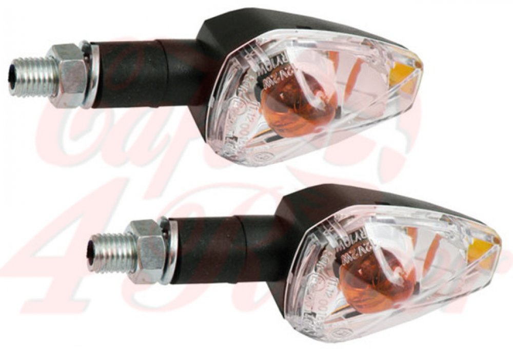 Černé pouzdro s čirým sklem schváleným ECE a malou žárovkou 12 V 21 W. - Čirá čočka schválená ECE - S žárovkou 21 W oranžové barvy - Rozměry přibližně 60 mm šířka x 38 mm výška x 50 mm hloubka. Závit M10 x 20 mm.