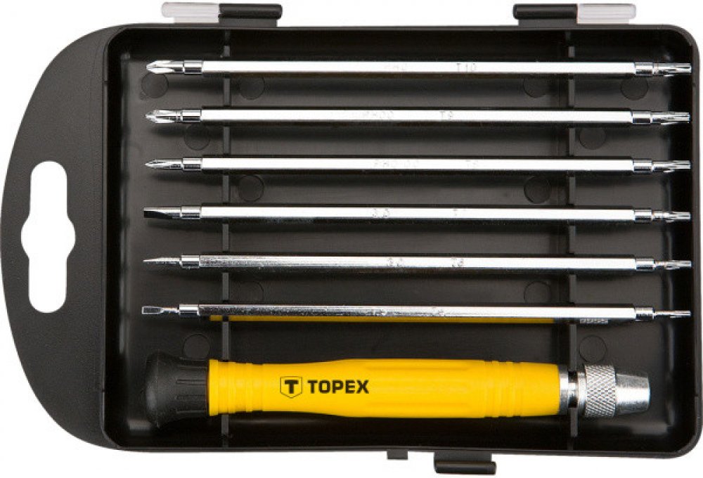 Přesné šroubováky, sada 7 ks, rukojeť šroubováku, 6 ks oboustranných oboustranných čepelí, velikosti: 1,5 mm x T5, 2 mm x T6, 3 mm x T7, PH000 x T8, PH00 x T9, PH0 x T10, CrV Sada přesných šroubováků TOPEX (ref. 39D551) obsahuje 6 oboustranných čepelí, tj. 12 bitů. Vyrobeno z vysoce kvalitní chrom-vanadiové oceli, která zajišťuje dlouhou životnost nástrojů. Ergonomická plastová rukojeť poskytuje pohodlí při práci. Praktický plastový obal pro snadné skladování. Značka TOPEX je určena pro kutily.