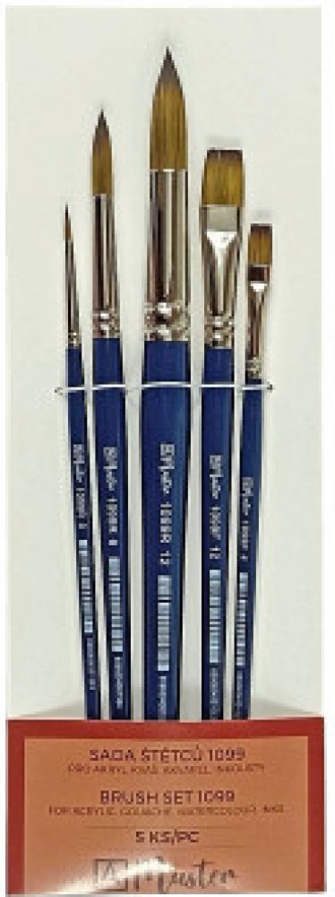 Kulaté syntetické štětce značky Master s krátkou dřevěnou lakovanou rukojetí. Tmavé štětiny jsou velmi elastické, ale zároveň dobře drží tvar. Jsou opravdu univerzální, vhodné jak pro akvarelové barvy či inkousty, tak také akrylové, temperové a olejové barvy.V sadě najdete štětce:kulatý štětec Master 1099R velikost 0kulatý štětec Master 1099R velikost 6kulatý štětec Master 1099R velikost 12plochý štětec Master 1099F velikost 4plochý štětec Master 1099F velikost 12