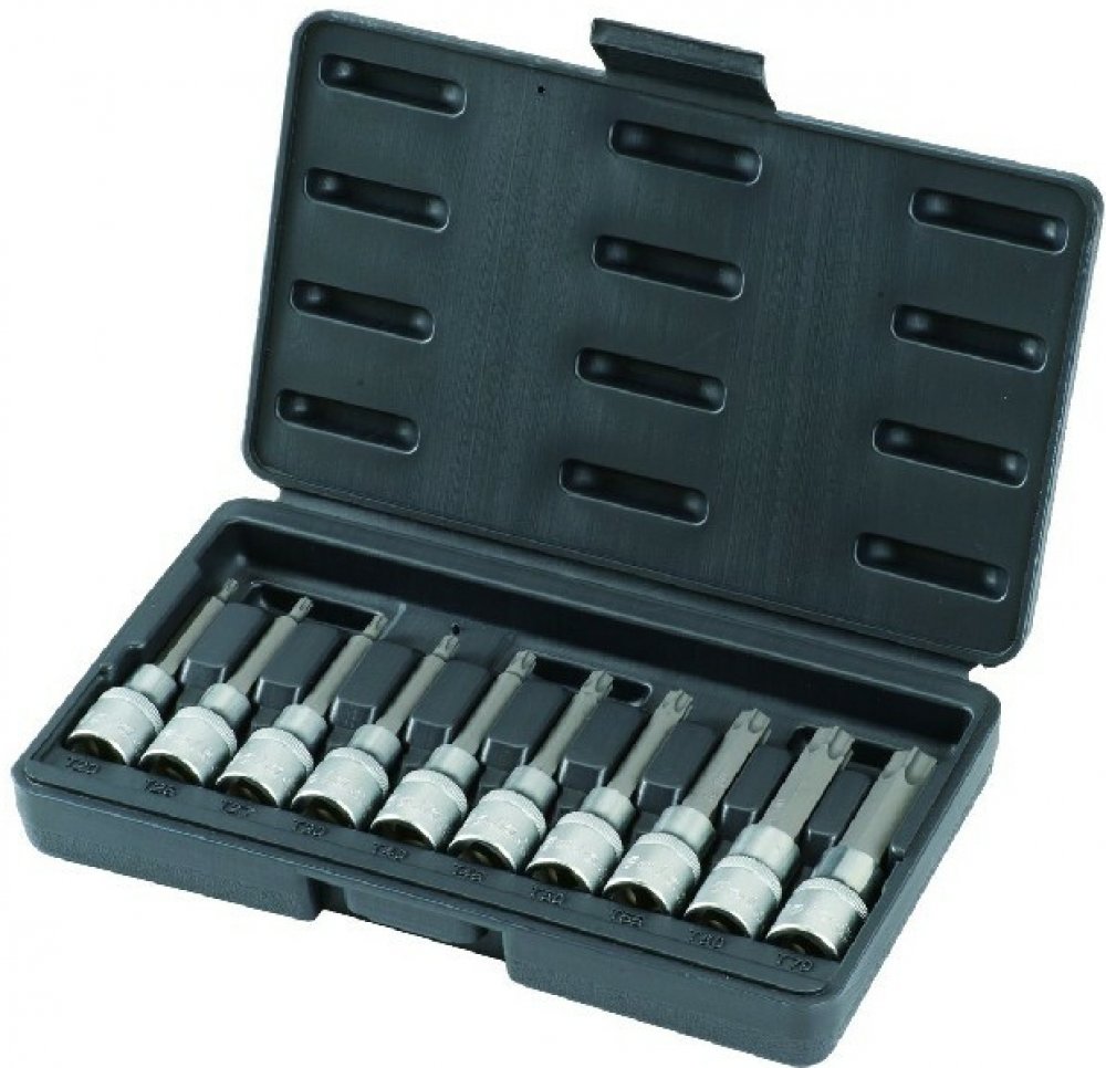 10 Dílná sada zástrčných hlavic TORX 1/2" prodloužené GOLA 120010LSada 1/2" prodloužených hlavic TORX Obsah sady: Prodloužené hlavice 1/2": TORX 20, 25, 27, 30, 40, 45, 50, 55, 60, 70