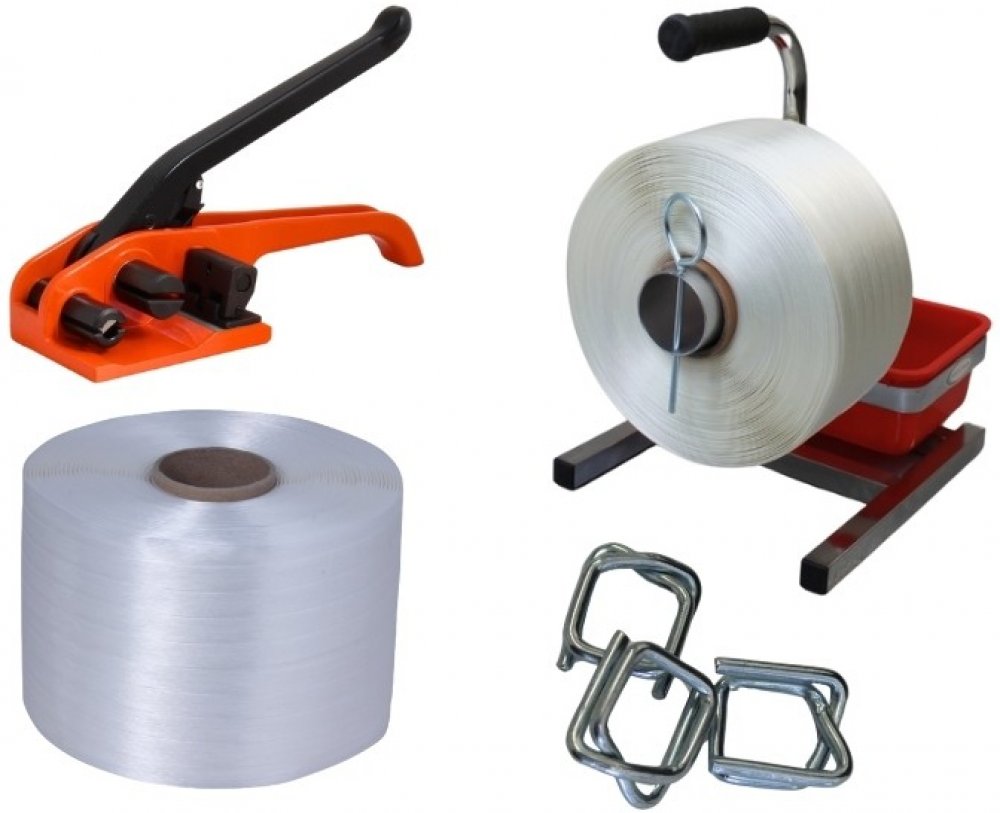 Sada vázací pásky PES šíře 13 mm a potřebného příslušenství.